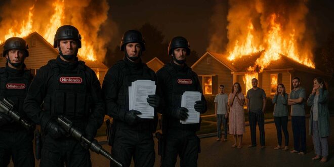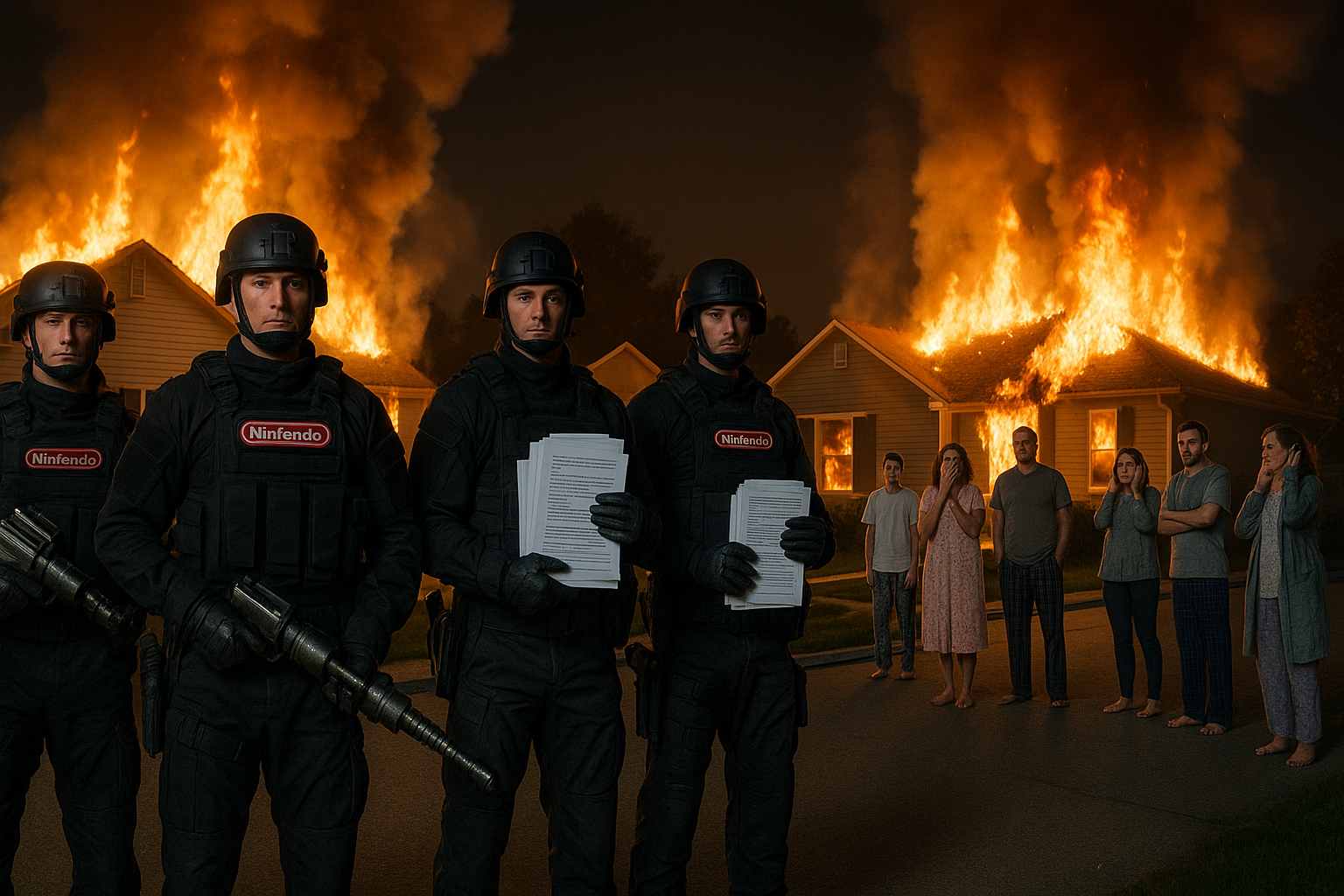 Critics have pointed out the irony and surreal nature of the situation. However, Nintendo’s CEO refused to apologize for the violence, instead proudly releasing drone footage of the smoldering subdivision as a “stern but fair” warning video titled: “Respect Our IP.”